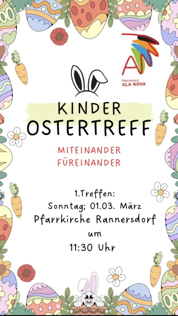 25 Feb. 2026 1.3.2026 Kinderostertreff von office@pfarre-schwechat.at | Veröffentlicht in: PGS Ankündigungen, Rannersdorf Ankündigungen | 0