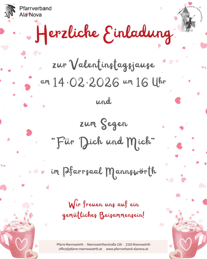 11 Feb. 2026 14.2.2026 Valentinssegen und Jause von office@pfarre-schwechat.at | Veröffentlicht in: Mannswörth Ankündigungen | 0