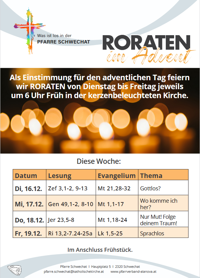 16 Dez. 2025 16.12.-19.12.2025 Roraten von office@pfarre-schwechat.at | Veröffentlicht in: Schwechat Ankündigungen | 0