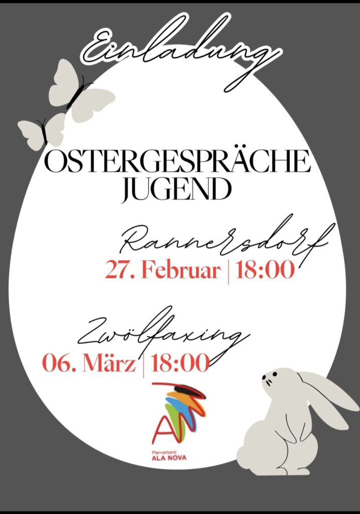 25 Feb. 2026 27.2.2026 Ostergespräche Jugend von office@pfarre-schwechat.at | Veröffentlicht in: PGS Ankündigungen, Rannersdorf Ankündigungen | 0