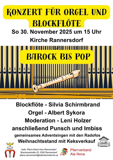 10 Nov. 2025 30.11.2025 Konzert für Orgel und Blockflöte von office@pfarre-schwechat.at | Veröffentlicht in: Rannersdorf Ankündigungen | 0